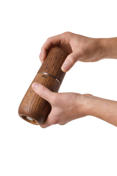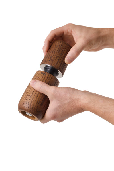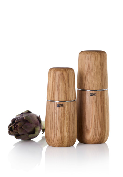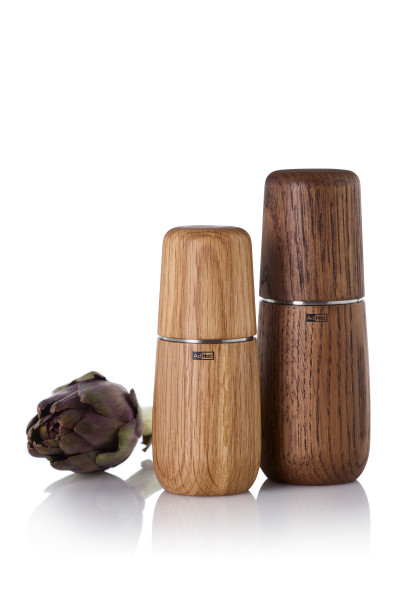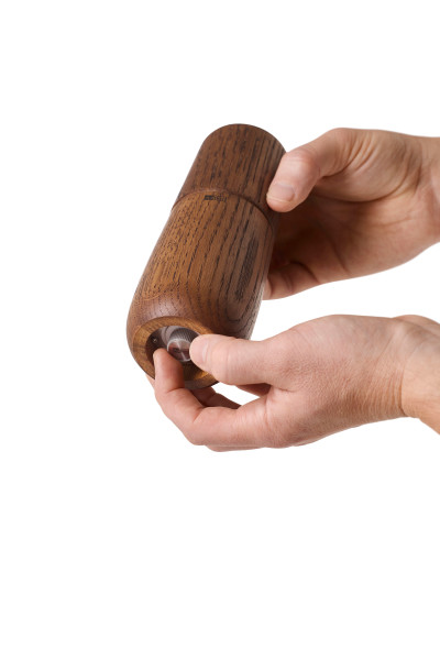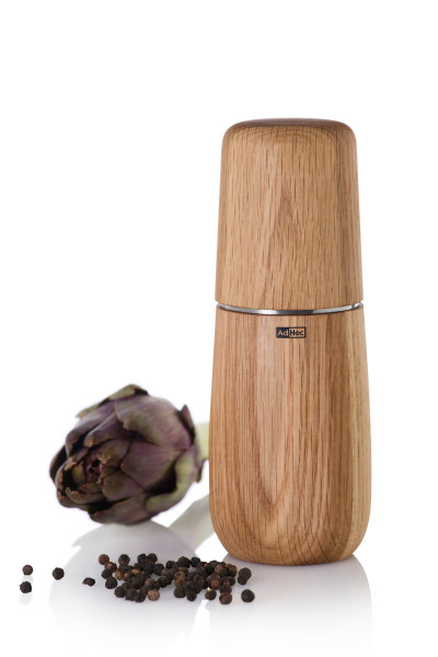 Mlinček za poper ali sol AdHoc Yono, izdelan iz naravnega hrasta in nerjavečega jekla. Njegova organsko tekoča oblika, izdelana iz visokokakovostnega hrasta, je udobna v roki.