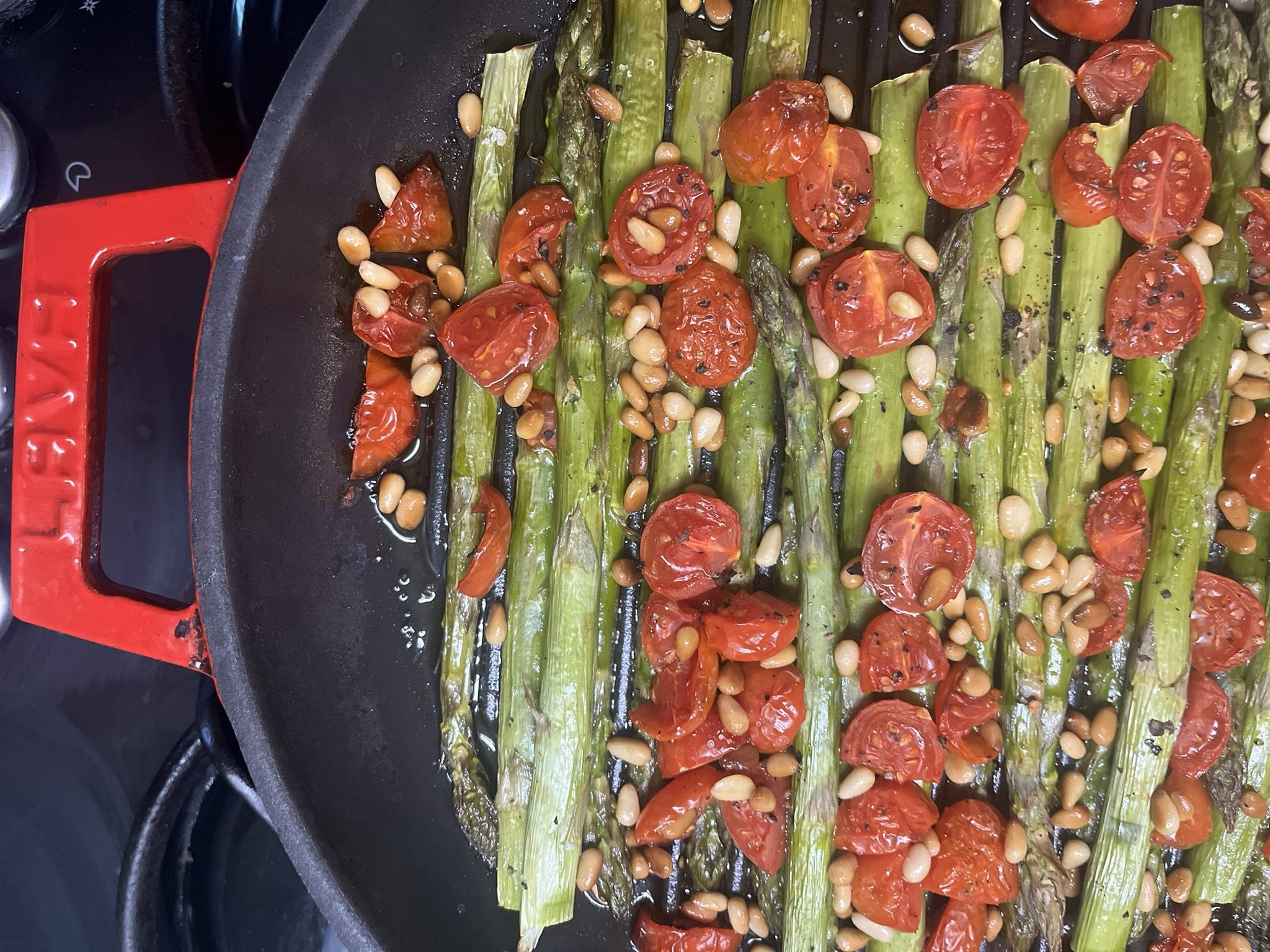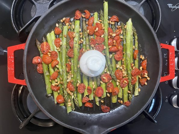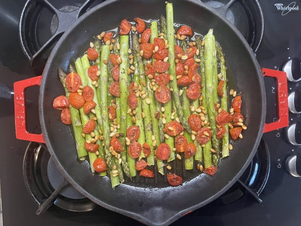 - V litoželezno posodo Lava dodamo oljčno olje, nato vanjo položimo pripravljene šparglje in paradižnik.